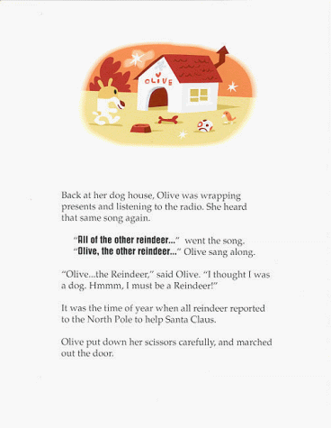 Olive is merrily preparing for Christmas when suddenly she realizes "Olive... the other Reindeer... I thought I was a dog. Hmmm, I must be a Reindeer!" So she quickly hops aboard the polar express and heads to the North Pole. And while Santa and the other reindeer are a bit surprised that a dog wants to join the their team, in the end Olive and her unusual reindeer skills are just what Santa and his veteran reindeer team need. Colorful graphic illustrations accompany this zany dog story from the well-known author and artist team, Vivian and J.otto Seibold. Adorable Olive and her hilarious adventures are sure to make anyone's Christmas merry.
