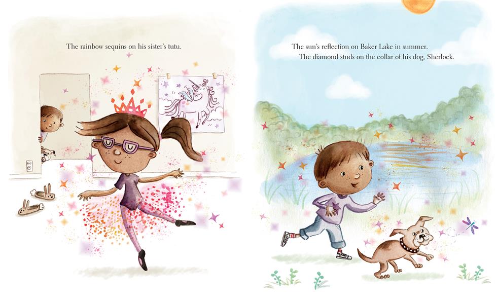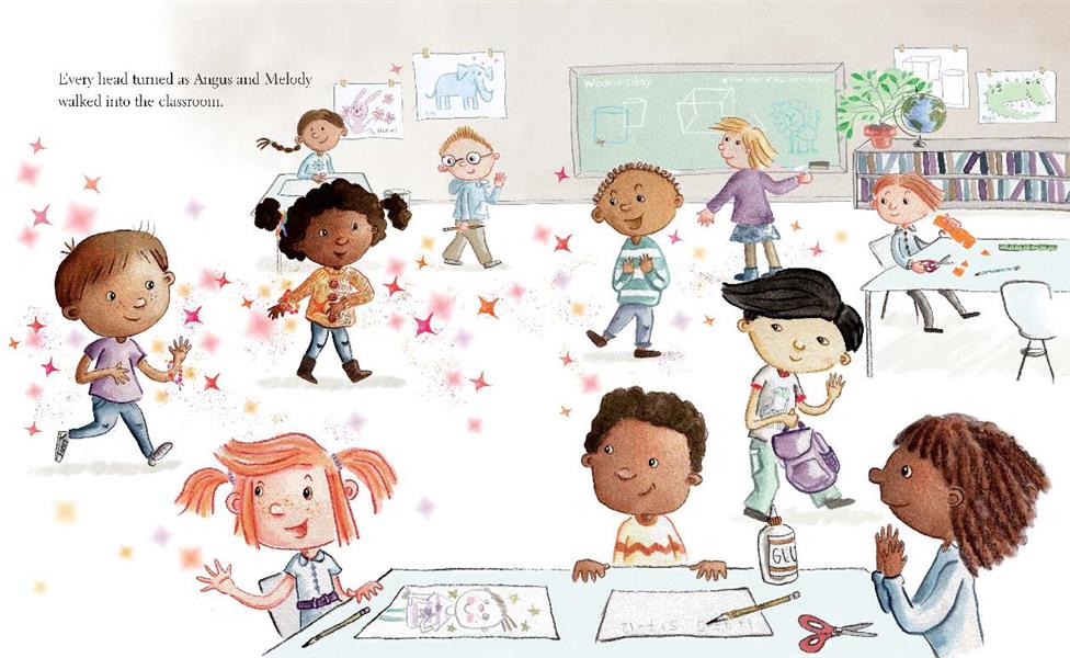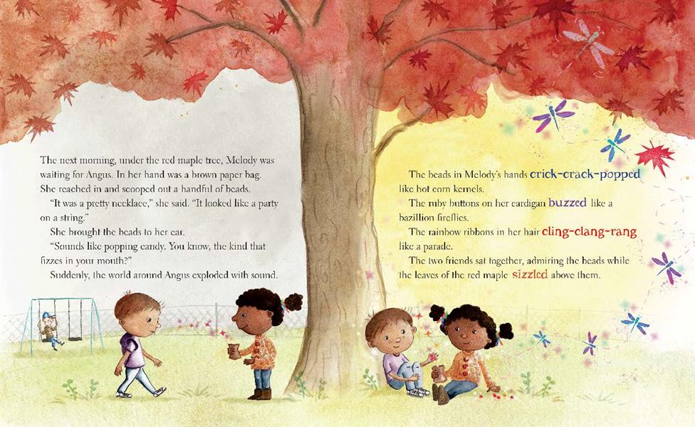 Angus loves sparkly things, so much so that he can hear them. To Angus, shiny objects not only look beautiful; they also crackle, buzz and go whiz-bang-POP! His unique ability is lost, however, when Angus wears his grandma's beaded necklace to school, and his classmates tease him for his atypical choice. Saddened by their laughter, Angus stops hearing the sparkle.