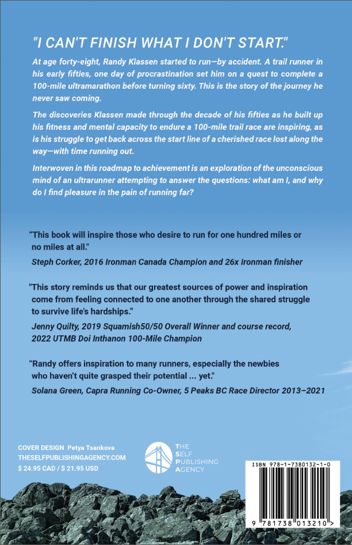 Readers will be intrigued by the challenges he faced as he increased his distances, sometimes by twist of fate, and the failures that befell him along the way. In this roadmap to achievement, Klassen generously shares the practical lessons he learned over those eleven years: questions runners ask when they hang with him, the sweeper at the back of the Saturday Capra Trail Running Club in Squamish, BC. He also takes the reader on a journey into the unconscious mind of an ultrarunner to answer the questions: what are we, and why do we find pleasure in the pain of running far?