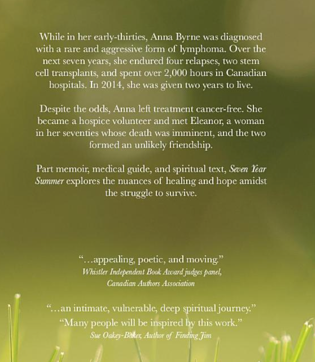Finalist for the 2020 Whistler Independent Book Awards. While in her early-thirties, Anna Byrne was diagnosed with a rare and aggressive form of lymphoma. Over the next seven years, she endured four relapses, two stem cell transplants, and spent over 2,000 hours in Canadian hospitals. In 2014, she was given two years to live. Despite the odds, Anna left treatment cancer-free. She became a hospice volunteer and met Eleanor, a woman in her seventies whose death was imminent, and the two formed an unlikely friendship. Part memoir, medical guide, and spiritual text, Seven Year Summer explores the nuances of healing and hope amidst the struggle to survive.