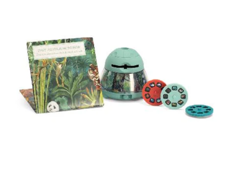 Discover the Animal Projector: 24 images to project, to spur the imagination and inspire stories about sky, sea and land animals. The built-in nightlight illuminates a magnificent landscape and switches off after 15 minutes. There are no batteries for this projector, it includes a USB connection for charging. 3 larger discs for larger images.