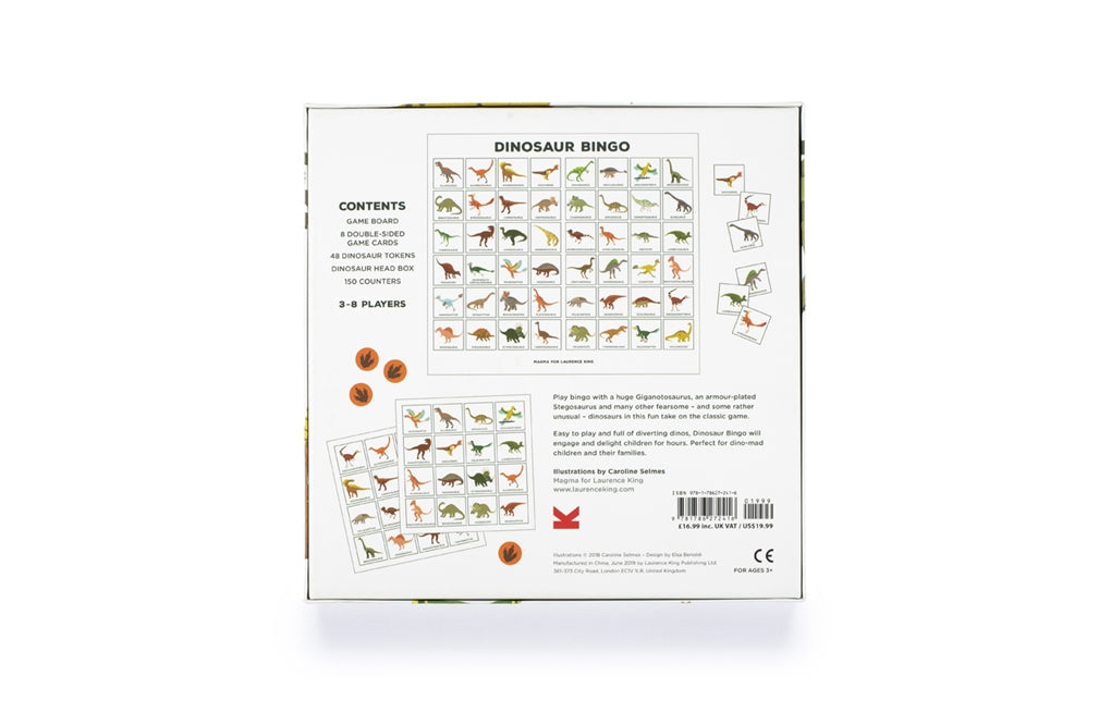 The set contains 48 illustrated dino chips as well as a cardboard dinosaur head to store them in, plus an illustrated game board, eight double–sided bingo cards and Jurassic counters ready for players to mark up their cards and score those points.